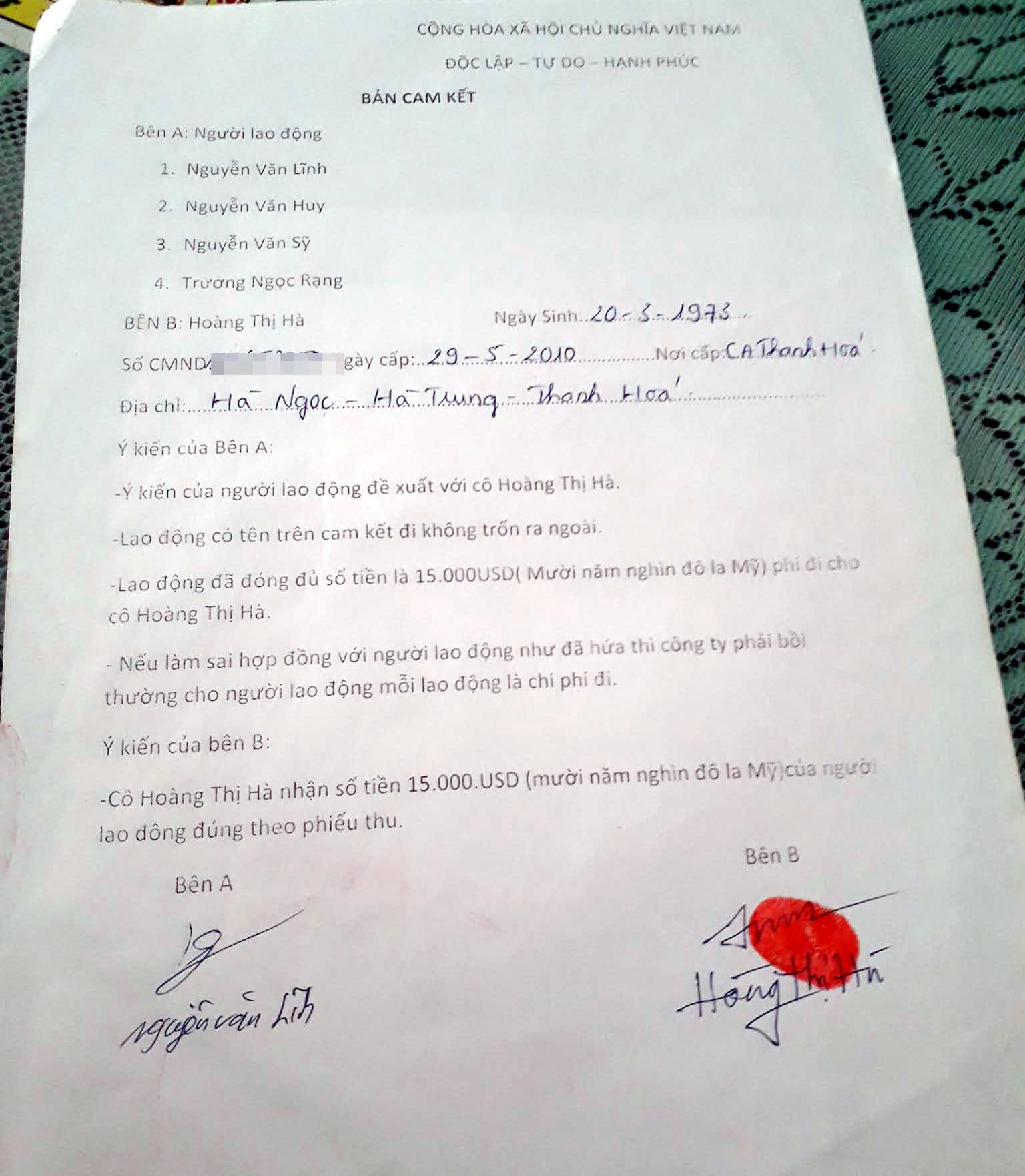 Sau khi trao đổi, vào tháng 3-2018, anh Lĩnh đã nộp 1 bộ hồ sơ cho bà Hà để thực hiện thủ tục đi XKLĐ tại Hàn Quốc trong 5 năm, với chi phí thỏa thuận 15 ngàn USD. Anh Lĩnh đã 3 lần chuyển đủ số tiền trên, quy ra VND. Lần 1: giấy chuyển hộ tiền lập ngày 15-3-2018, số tiền 69 triệu đồng, do nhân viên của bà Hà thu tiền. Lần 2, anh Lĩnh nộp trực tiếp cho bà Hà số tiền 45 triệu đồng theo Giấy chuyển hộ tiền lập ngày 16-5-2018. Lần 3, anh Lĩnh nộp 215 triệu đồng cho bà Hà theo giấy chuyển tiền hộ, nhân viên bà Hà thu tiền. Sau khi thanh toán tiền lần cuối, anh Lĩnh và bà Hà lập bản cam kết với nội dung lao động cam kết không trốn ra ngoài; lao động đã đóng đủ số tiền là 15 ngàn USD chi phí cho bà Hà; nếu làm sai hợp đồng với người lao động như đã hứa thì công ty phải bồi thường cho người lao động là chi phí đi...