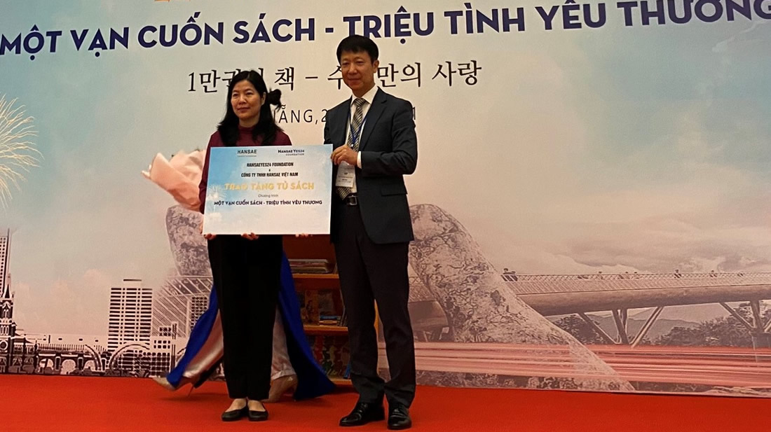Đại diện lãnh đạo công ty Hansae Việt Nam trao tặng 1 vạn cuốn sách cho đại diện lãnh đạo ngành GD-ĐT TP Đà Nẵng. |