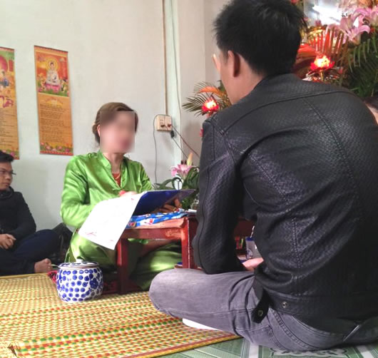 Rời nhà “cô” T., chúng tôi đến nhà “cô” X. trên đường Nguyễn Huy Tưởng, Đà Nẵng. Trên căn gác chật hẹp nghi ngút khói hương, “cô” X. trạc 50 tuổi, phấn son lòe loẹt, vận một bộ đồ màu xanh, miệng ngậm điếu thuốc phì phèo đang xem chỉ tay cho Thơm (sinh viên của Trường Đại học Đà Nẵng). “Cô” X. phán: “Con có người âm phải lòng nên không để cho con được kết duyên với ai. Vong này còn đi theo gây rắc rối, phá vỡ những mối tình của con. Giờ muốn hóa giải mối duyên này phải làm lễ, chi phí trung bình là 6 triệu đồng nếu làm riêng hoặc 500 nghìn đồng nếu làm chung với các cô gái khác”. Nghe “cô” nói vậy, Thơm buồn rầu, lo lắng không yên. Thấy thế, “cô” X. động viên: “Mới đây cũng có con bé bị duyên âm theo, sau khi “cô” làm lễ cắt duyên âm cho thì vừa ra trường là xây dựng được gia đình ngay, bởi vậy bây giờ nó tin mỗi “cô” thôi chứ không tin ai hết”.