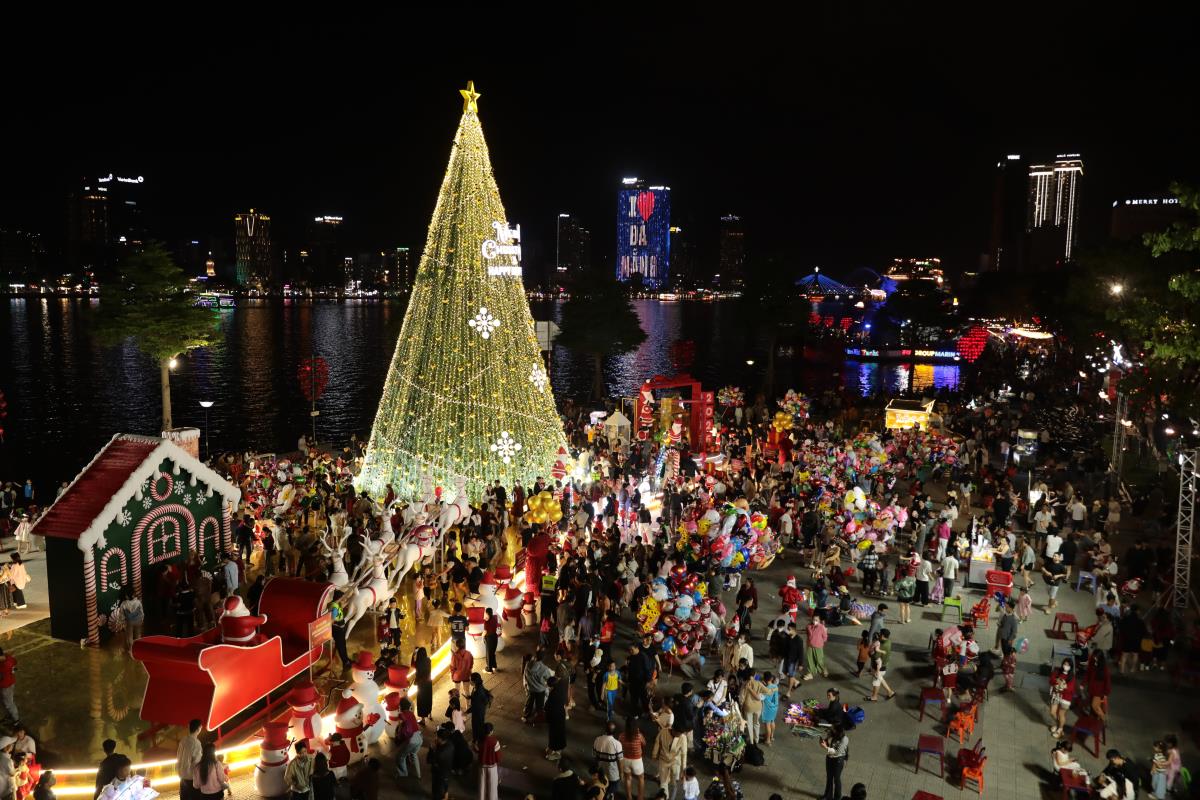 1. Năm nay, không gian lễ hội tại Đà Nẵng được đầu tư quy mô và bài bản hơn. Từ giữa tháng 12, các tuyến đường trung tâm như Bạch Đằng, Trần Phú, Lê Duẩn, Trần Hưng Đạo… đã khoác lên mình sắc màu Noel rực rỡ. Không gian Giáng sinh rực rỡ, được bố trí tại sàn cảnh quan phía Bắc bờ Đông cầu Rồng (phường An Hải), mang đến một điểm hẹn lễ hội ấm áp và lung linh giữa lòng thành phố. Điểm nhấn trung tâm là cây thông Noel cao 20m, được trang trí bằng hệ thống đèn LED đổi màu, tỏa sáng nổi bật trong không gian mở ven sông. Bao quanh là các tiểu cảnh quen thuộc của mùa Giáng sinh như ông già Noel, xe tuần lộc, kẹo gậy, nhà tuyết, người tuyết…, tạo nên khung cảnh sinh động, gần gũi và giàu cảm xúc. Tổng thể không gian không chỉ mang đậm không khí lễ hội cuối năm mà còn trở thành điểm check-in hấp dẫn cho người dân và du khách, góp phần lan tỏa tinh thần Giáng sinh an lành, năm mới vui tươi và gắn kết trong mùa lễ hội chào đón năm mới tại Đà Nẵng.