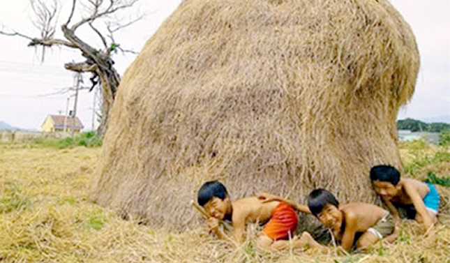 Buổi chiều, sau khi gom hết những cơn nắng chói chang vào người, những sợi rơm ngập nắng, cong cong, khô giòn, vàng ruộm. Rơm buổi chiều không dậy mùi độc đáo như buổi sáng, sợi rơm no nắng vàng lấp lánh, thơm thuần nhất mùi rơm khô. Đây là lúc trẻ nhỏ trông chờ. Rơm khô nhẹ bẫng, leo lên đống rơm, cảm giác bồng bềnh như được ở trên những lọn mây. Chúng tôi thích chí reo hò, nhảy nhót, leo lên, trượt xuống, hất tung rơm vào người nhau cười rộn rã. Lăn lộn đã rồi đổi qua chơi trò trốn tìm với rơm. Chia nhau ở các nọc rơm ngoài sân kho, phủ rơm lên người cho bạn tìm. Điểm hấp dẫn của trò này là cứ lặn trong rơm, đợi bạn đầu hàng thì bất ngờ vung rơm chạy ra, sảng khoái cười ha ha cảm giác người thắng cuộc. Có nhiêu vậy nhưng những trò chơi với rơm không khiến chúng tôi chán. Chơi mãi, chơi đến chừng mệt lả thì nằm ngửa trên những sợi rơm khô, khoan khoái ngửa mặt nhìn những đám mây đang bồng bềnh trên tầng cao, nhìn cánh cò đập mạnh rồi tưởng tượng về một thế giới huyền bí xa xăm nào đó…