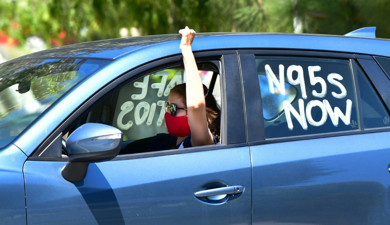 Các y tá làm việc tại Bệnh viện Providence Saint John, ở California, Mỹ và những người ủng hộ biểu tình đòi thiết bị bảo hộ tốt hơn. Ảnh: AFP |