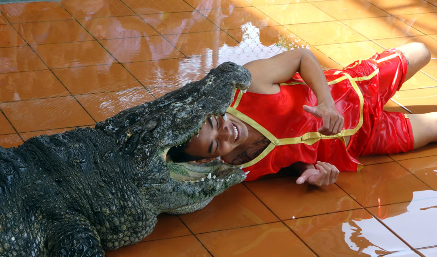Khu vực biểu diễn xiếc cá sấu rộng khoảng 500m2; gồm một hồ dành cho cá diện tích 100m2, sâu 0,5m, có 4 con đang nằm phơi mình trên sàn xi-măng giữa hồ. Ông Hải cho biết: Cả 4 con sấu ở đây phải có giấy chứng nhận của Chi cục Thú y tỉnh Khánh Hòa mới được nuôi dưỡng và sử dụng. Đã đến giờ biểu diễn. Một nhân viên ra mở cửa cho khách vào sân khấu hai bên hồ. Anh diễn viên xiếc cá sấu người Thái, mặc bộ áo quần màu đỏ bước xuống hồ, đánh thức từng con, đuổi chúng xuống nước, rồi lại cầm đuôi lôi từng con lên sàn xi-măng để bắt đầu biểu diễn. Người xem trầm trồ, thán phục trước từng động tác, nhất là khi anh đưa tay ra trước mặt con cá lớn thứ hai trong đàn, nhứ nhứ làm cho cá “tức giận” đớp bóng một cái “choắp” trước sự “thót tim” của người xem. Tiết mục thứ hai với con sấu lớn nhất, nặng đến 250kg. Khi con cá đã nằm ngay ngắn trên sàn diễn, người quản sấu trèo lên mình nó, dùng cây gậy nhỏ đập đập vào lưng, cầm đuôi lắc qua, lắc lại, sờ mó, vuốt ve,... Đoạn anh đi lên phía đầu, dùng hai tay mở miệng cá. Con sấu ngoan ngoãn “chấp hành” há hốc mồm, đầu ngửng cao, ra vẻ “tự hào” lắm. Anh quản xiếc chui đầu vào miệng cá, quay qua, quay lại trước những tràng pháo tay vang dội của du khách.