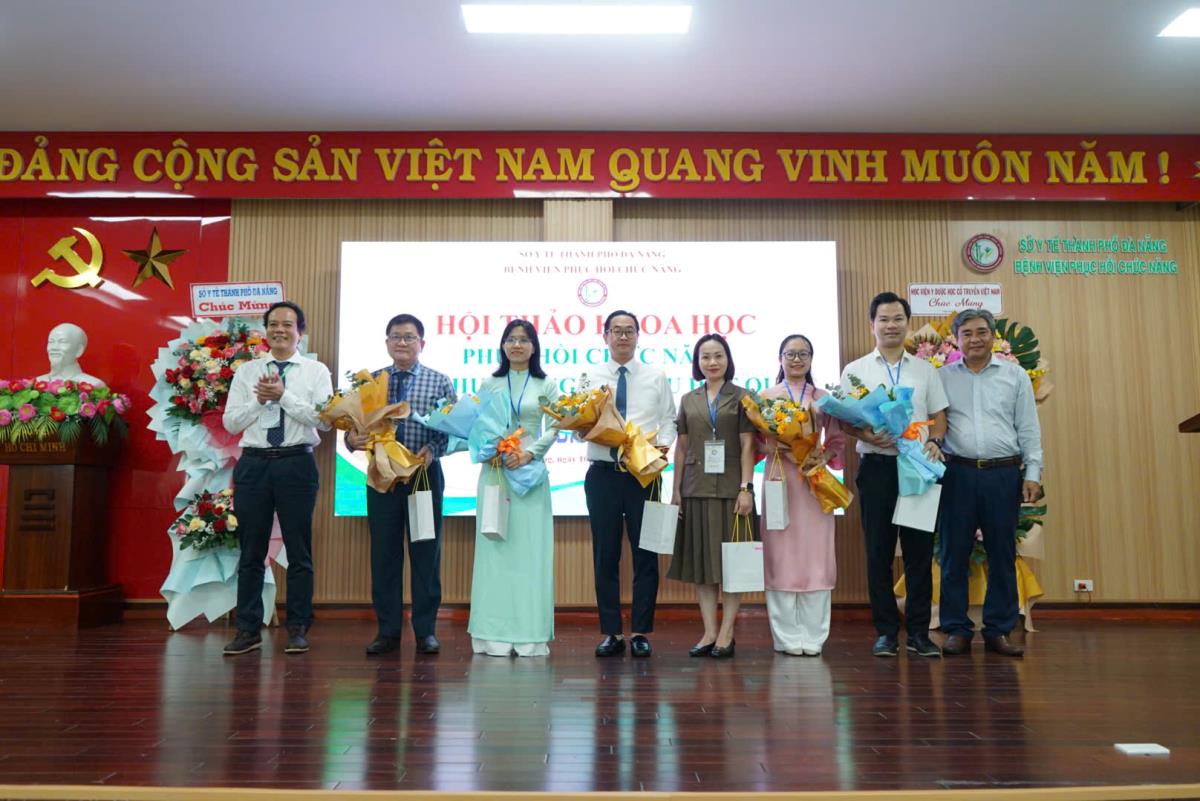 Phó Giám đốc Sở Y tế TP Đà Nẵng Trương Văn Trình và TS.BS Nguyễn Văn Dũng-Giám đốc Bệnh viện PHCN Đà Nẵng tặng quà tri ân các y, bác sĩ, chuyên gia đầu ngành tham gia báo cáo chuyên đề tại hội thảo.