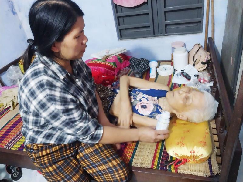 Hằng ngày, chị Hường vừa làm công việc nhà, vừa tận tâm chăm sóc mẹ chồng. Mẹ chồng chị, bà Nguyễn Thị Triều (86 tuổi), bị nhiều bệnh mãn tính, nằm liệt giường, đi lại phải có người dìu đỡ. Mọi việc ăn uống, sinh hoạt của bà Triều đều do chị Hường lo liệu với sự hỗ trợ của chồng con. Mặc dù khó khăn, chật vật, nhưng chị Hường lúc nào cũng cung kính, ân cần và hết lòng yêu thương mẹ chồng, bà con hàng xóm ai cũng cảm phục. Người phụ nữ nghèo chia sẻ: “Từ năm 2007 mẹ yếu hẳn, không đi lại được như trước nữa. Vợ chồng tôi và các con thường xuyên xoa bóp chân tay cho mẹ, chỉ mong mẹ được sống lâu với con cháu”. Cũng theo chị Hường, bình quân mỗi tháng nhà chị thu nhập 7 triệu đồng từ kết quả chăn nuôi heo, gà. Còn chồng làm lao động phổ thông, ai kêu gì làm nấy. Để có thêm thu nhập, buổi tối chồng chị chạy xe đi xin nước bả ở các nhà hàng, quán cơm đem về cho heo ăn.