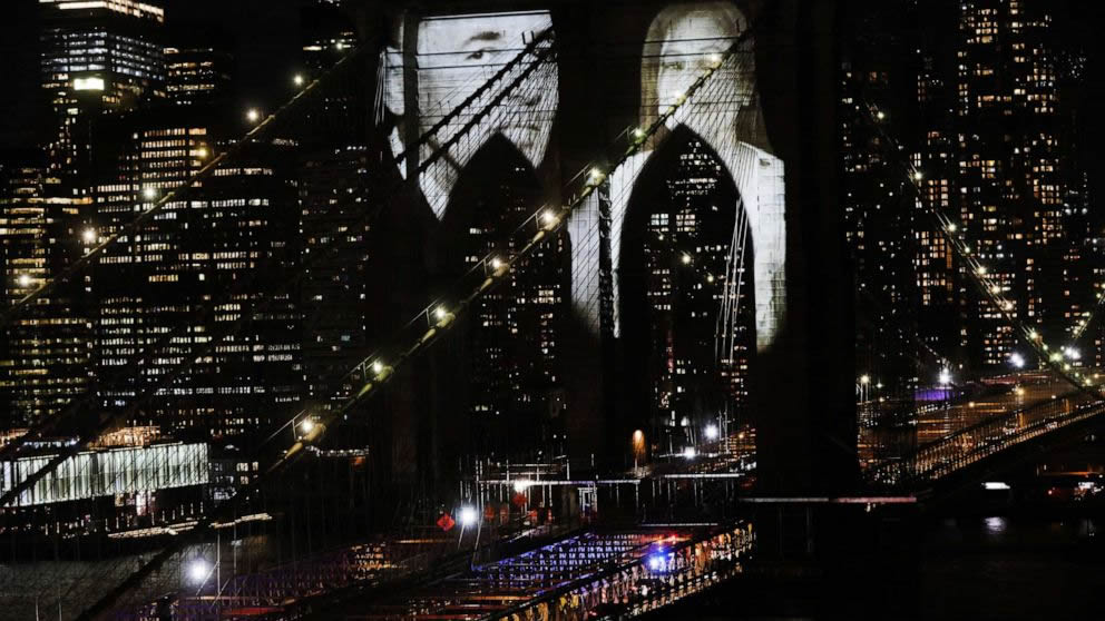 Hình ảnh người dân New York tử vong do đại dịch COVID-19 được chiếu trên cầu Brooklyn trong lễ tưởng niệm. Ảnh: Getty Images |
