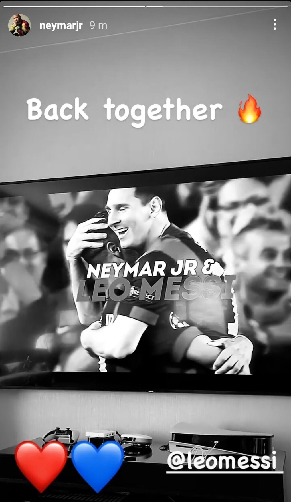 "Lại sát cánh cùng nhau", Neymar viết trên Instagram, kèm tấm ảnh anh đang ôm Messi khi cả hai còn khoác áo Barca.