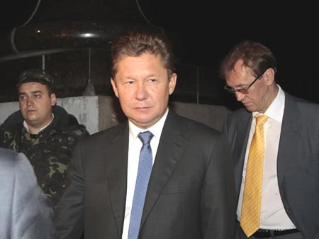 | Giám đốc điều hành Gazprom Alexei Miller (giữa) rời khỏi tòa nhà chính phủ Kiev sau cuộc đàm phán. Ảnh: AP |