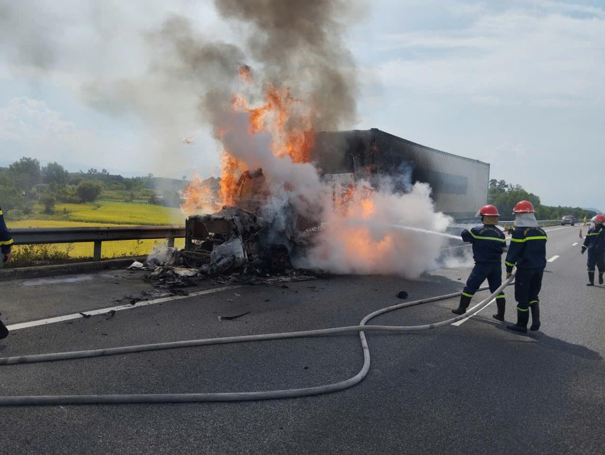 Chiều 23-8, tại Km45+300 tuyến cao tốc Đà Nẵng - Quảng Ngãi (địa phận xã Thăng Bình, TP Đà Nẵng) xảy ra vụ cháy xe container kéo sơ-mi rơ-moóc BKS 63R-008.06 chở hàng.