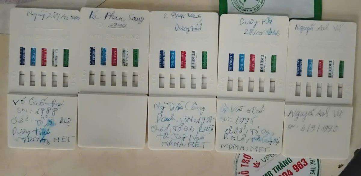 Kết quả xét nghiệm nhanh cho thấy cả 5 đối tượng đều dương tính với các chất ma túy loại Methamphetamine và MDMA.