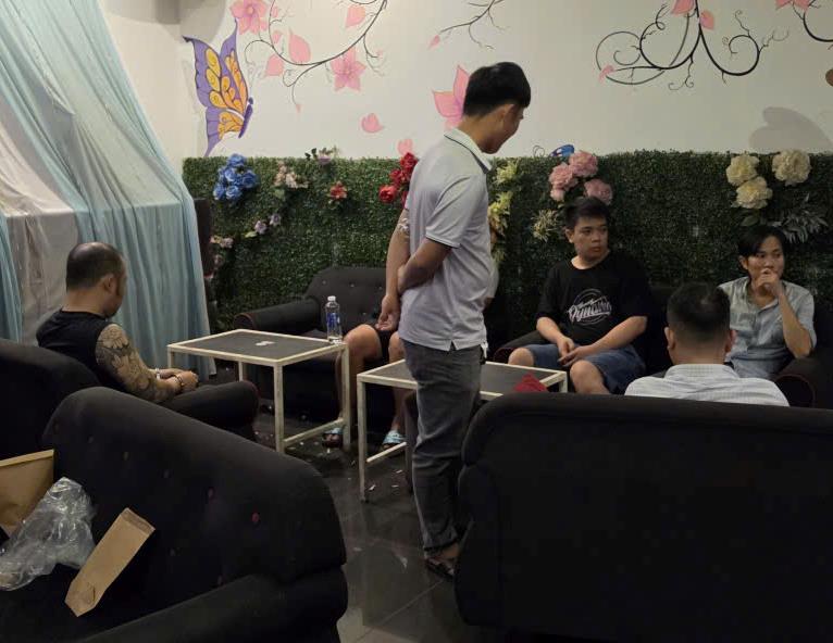 Tại tầng 2 của quán, lực lượng chức năng phát hiện 5 đối tượng, gồm: Lê Phan Sang (1994), Nguyễn Anh Vũ (1990, cùng trú phường Cẩm Thành); Lê Văn Hải (1995), Nguyễn Trần Công Danh (1987) và Võ Quốc Đại (1988, cùng trú phường Nghĩa Lộ).