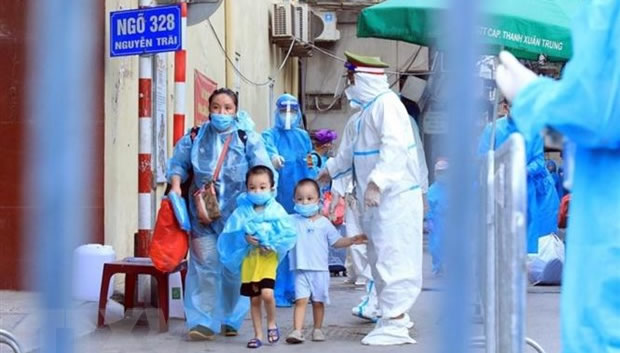 Trẻ em ở Hà Nội theo gia đình đến khu cách ly. |