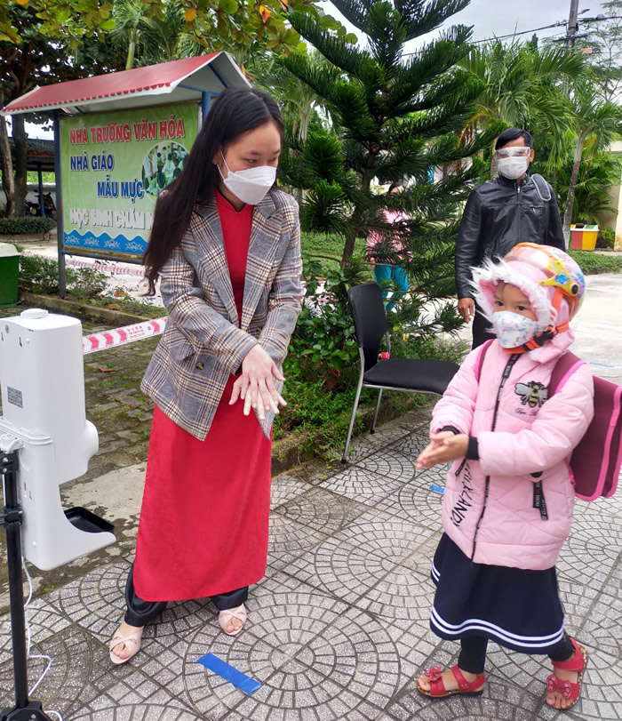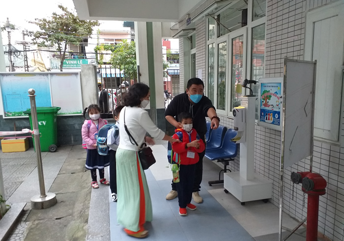 Trước khi dẫn học trò lên lớp, giáo viên chủ nhiệm và cán bộ trường TH Trần Cao Vân (Q.Thanh Khê) hướng dẫn HS đo thân nhiệt, sát khuẩn tại máy tự động
