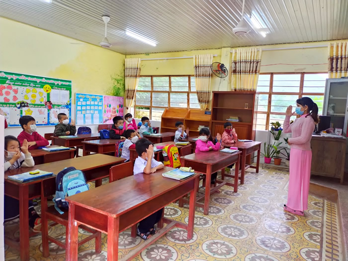 Sau khi vào, GVCN lớp 1 trường TH Hòa Phú hướng dẫn học trò cách giơ tay phát biểu