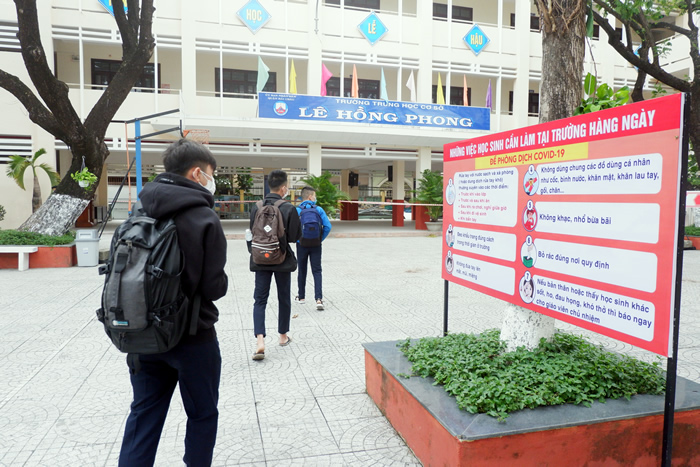 Sáng nay (6-12), học sinh (HS) 3 khối lớp 1 của bậc tiểu học (TH), lớp 8, 9 của bậc THCS trên địa bàn TP Đà Nẵng (trừ Q.Liên Chiểu) đã trở lại trường học sau hơn 3 tháng học online.
