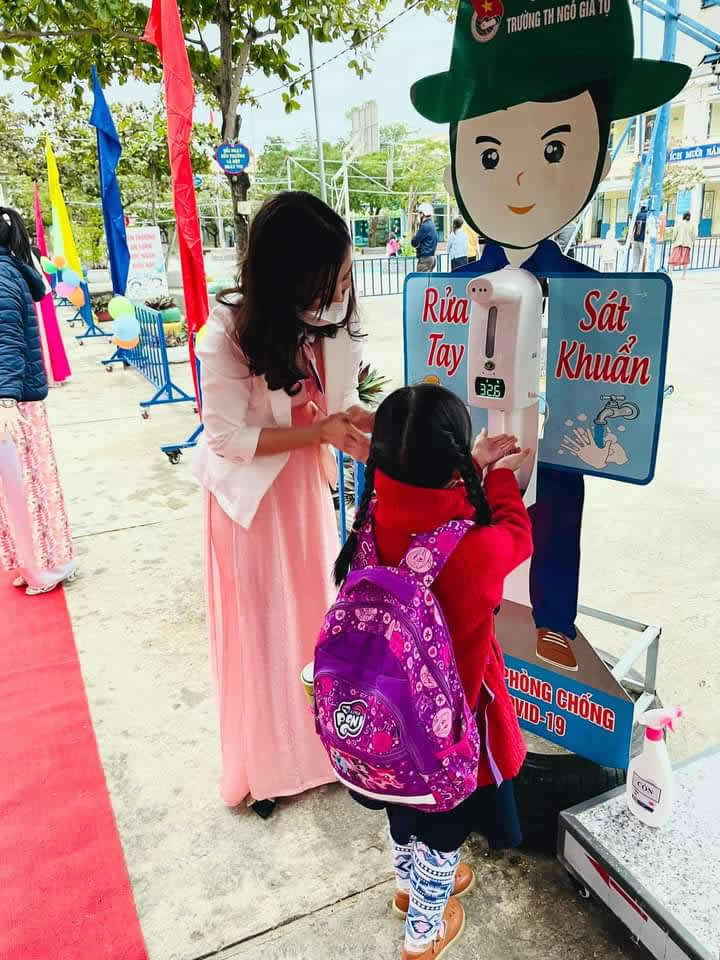 Trường TH Ngô Gia Tự (Q.Sơn Trà) rộn ràng đón HS lớp 1 đến trường, hướng dẫn các em sát khuẩn, đo thân nhiệt trước khi được cô giáo dẫn lên lớp học.