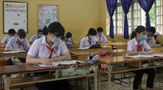 Học sinh trường THCS Lương Thế Vinh, tỉnh Phú Yên được bố trí chỗ ngồi giãn cách. |