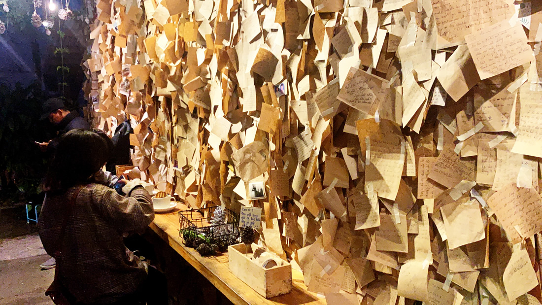 Có hai vị trí đẹp nhất ở nơi này, một là chiếc bàn dài ngay bên dưới những lá thư, hai là chiếc bàn có hai ghế ngồi cũng ở bên dưới những lá thư bên kia, cách nhau cái cửa ra vào. Tôi chọn chiếc bàn bên kia vì chiếc bàn dài có hai bạn trẻ đã ngồi từ trước. Cô con gái chắc là sinh viên năm nhất cho tôi biết cô ấy tới đây rất nhiều lần, và rất yêu nơi chốn này, cô tạo dáng cho tôi chụp một kiểu hình. Sau khi đi một vòng tham quan, mua ít đồ như tinh dầu, các dây đeo bằng gỗ... tôi ngồi cà-phê và tẩn mẩn đọc những lá thư tình.