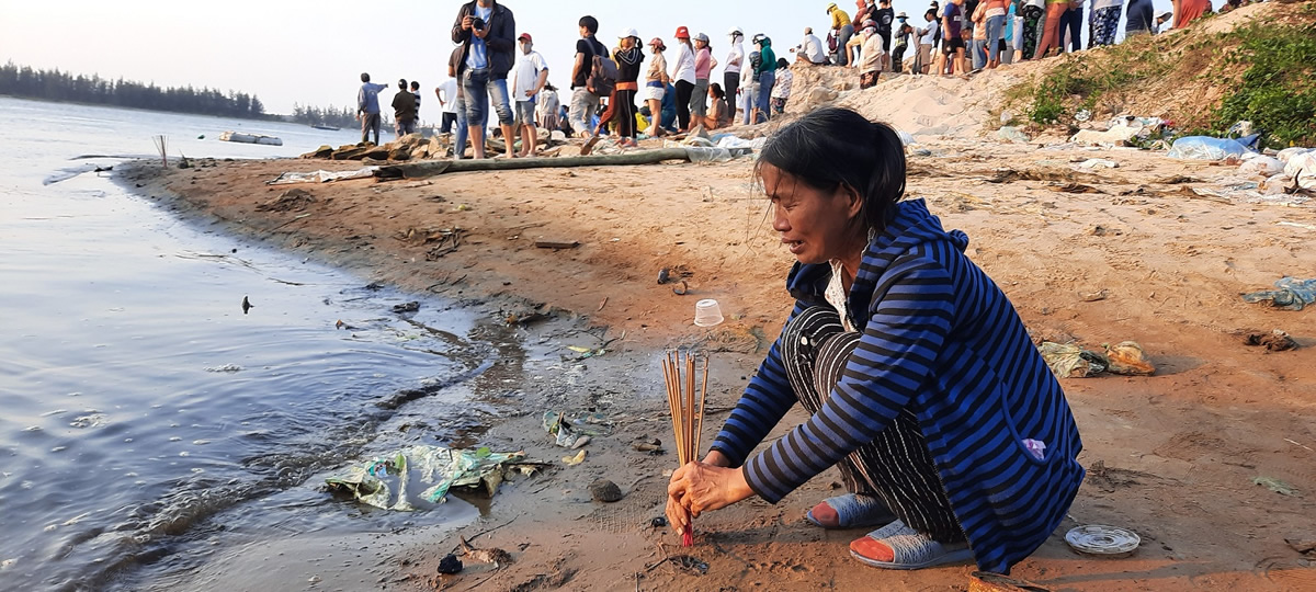Bà Đoàn Thị Hoa (57 tuổi) cô nạn nhân Đoàn Nguyễn Nhơn Hiếu (27 tuổi) cầm bó hương, lê từng bước ra bờ sông chắp tay khóc lóc, miệng luôn khấn vái cầu cháu mình được bình an vô sự. “Nó mới đi bộ đội về được mấy tháng, cũng mới xin được công việc làm cơ khí với nhóm bạn. Sáng nay nó bảo với gia đình là đi chơi với bạn, ai ngờ lại xảy ra cớ sự này. Cha mẹ nó đã già yếu, lại đang bị bệnh nặng không biết vượt qua khỏi nỗi đau này không”, bà Hoa nghẹn ngào.