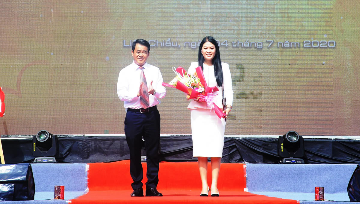 Lãnh đạo Q. Liên Chiểu tặng hoa chúc mừng Cty Tập đoàn Trung Thủy – Đơn vị tham gia thực hiện Đề án Du lịch cộng đồng. |