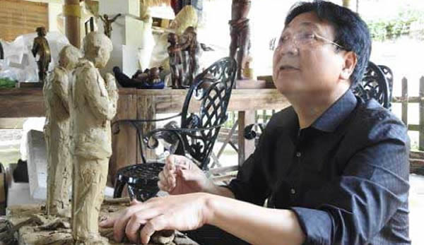 Nghệ sĩ Nhân dân Vương Duy Biên say sưa bên một tác phẩm điêu khắc. |