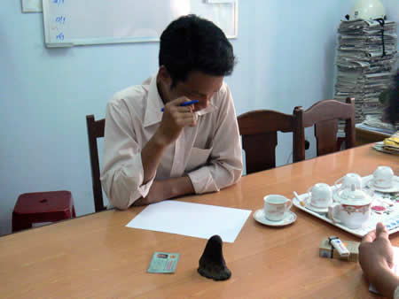 Qua điện thoại với anh T., người bán giới thiệu tên Tiền, có chiếc sừng tê giác gia truyền hơn 100 năm do ông tổ để lại, trọng lượng 190g, bán với giá 60 triệu đồng. Tiền bảo nhà ở Cẩm Lệ, nhưng không cho địa chỉ cụ thể mà hẹn trao đổi việc mua bán ngoài quán cà-phê. Ngày hôm sau, anh ta đồng ý gặp mặt tại khu vực ngã tư Nguyễn Hữu Thọ - Nguyễn Khoái (Q. Hải Châu). Tiền đến nhưng không mang theo chiếc sừng mà chỉ cho anh T. xem chiếc sừng qua ảnh. Hơn nữa Tiền chủ động bắt đầu cuộc nói chuyện không phải từ chiếc sừng mà “quần” người mua làm việc ở