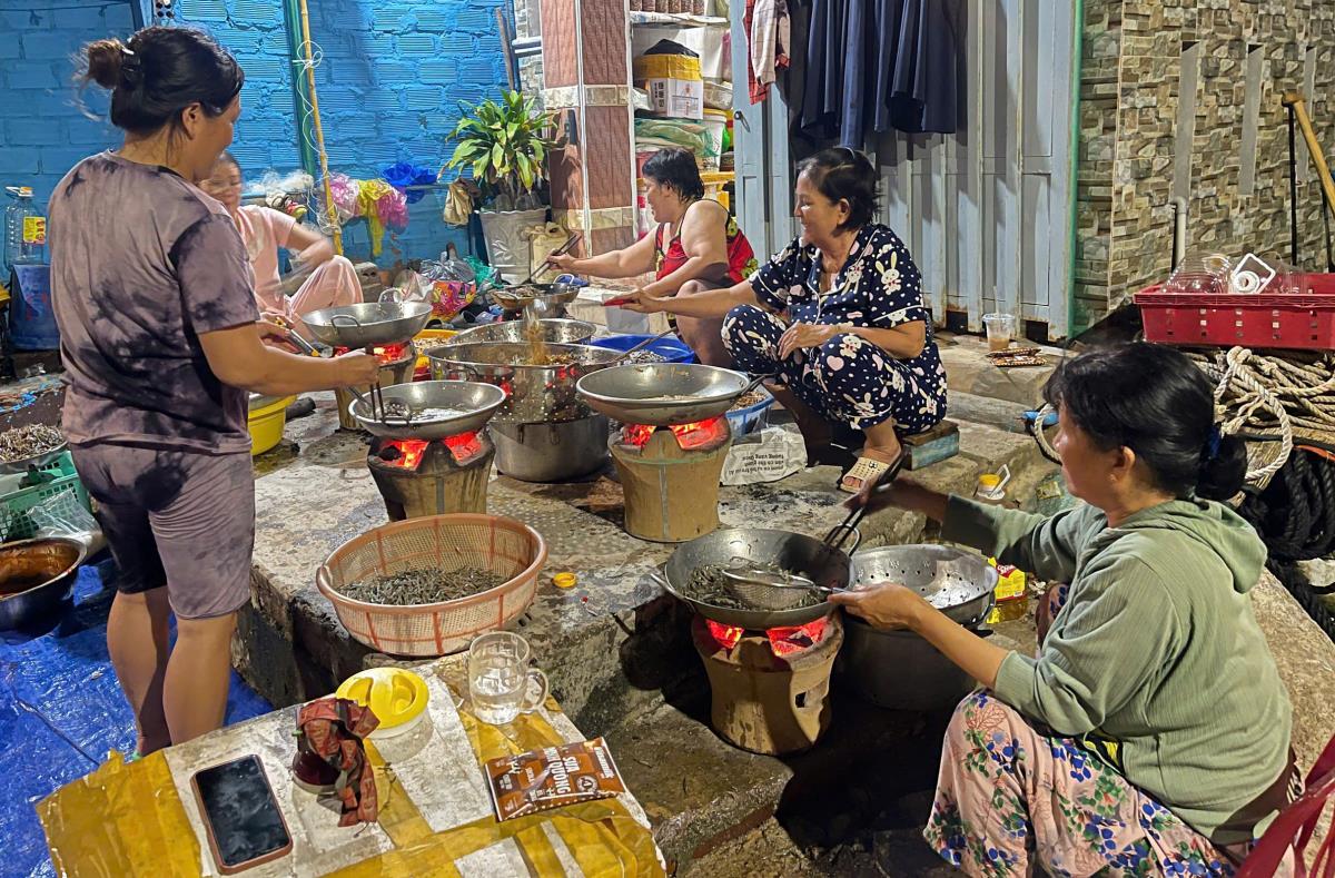 Người nhóm bếp, người nhặt cá, người rim, người gói hũ, người đóng thùng... Không ai bảo ai, tất cả đều hối hả, cùng chung một mong muốn: những hũ cá cơm rim sớm đến tay bà con đang chịu thiệt hại nặng nề do thiên tai.