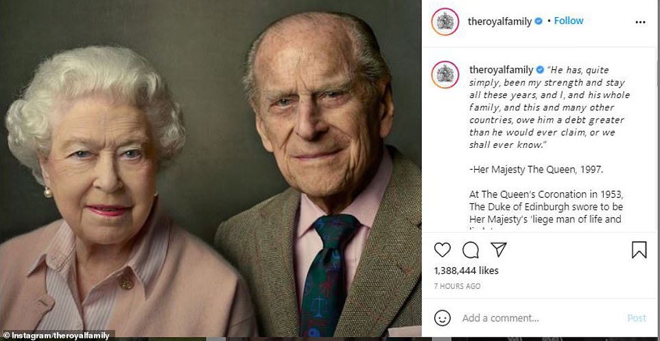 Nữ hoàng Anh chia sẻ một bức ảnh chụp với chồng, Công tước xứ Edinburgh (do nhiếp ảnh gia nổi tiếng Annie Leibovitz chụp vào năm 2016, đánh dấu sinh nhật lần thứ 90 của bà), để tưởng nhớ ông. Ảnh: Dailymail |
