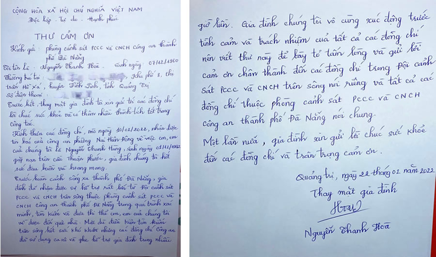 Vừa qua, Đội Cảnh sát PCCC và CNCH trên sông (Phòng Cảnh sát PCCC và CNCH - Công an TP Đà Nẵng) nhận được thư cảm ơn của người nhà nạn nhân trong vụ nhảy cầu Thuận Phước ngày 10-2. Trong thư, anh Nguyễn Thanh Hòa (1960, trú Vĩnh Linh, Quảng Trị) bày tỏ, trong điều kiện ở xa, gia đình đã nhận được sự hỗ trợ rất lớn từ Đội Cảnh sát PCCC và CNCH trên sông trong quá trình xác minh, tìm kiếm và đưa thi thể người thân về quê.