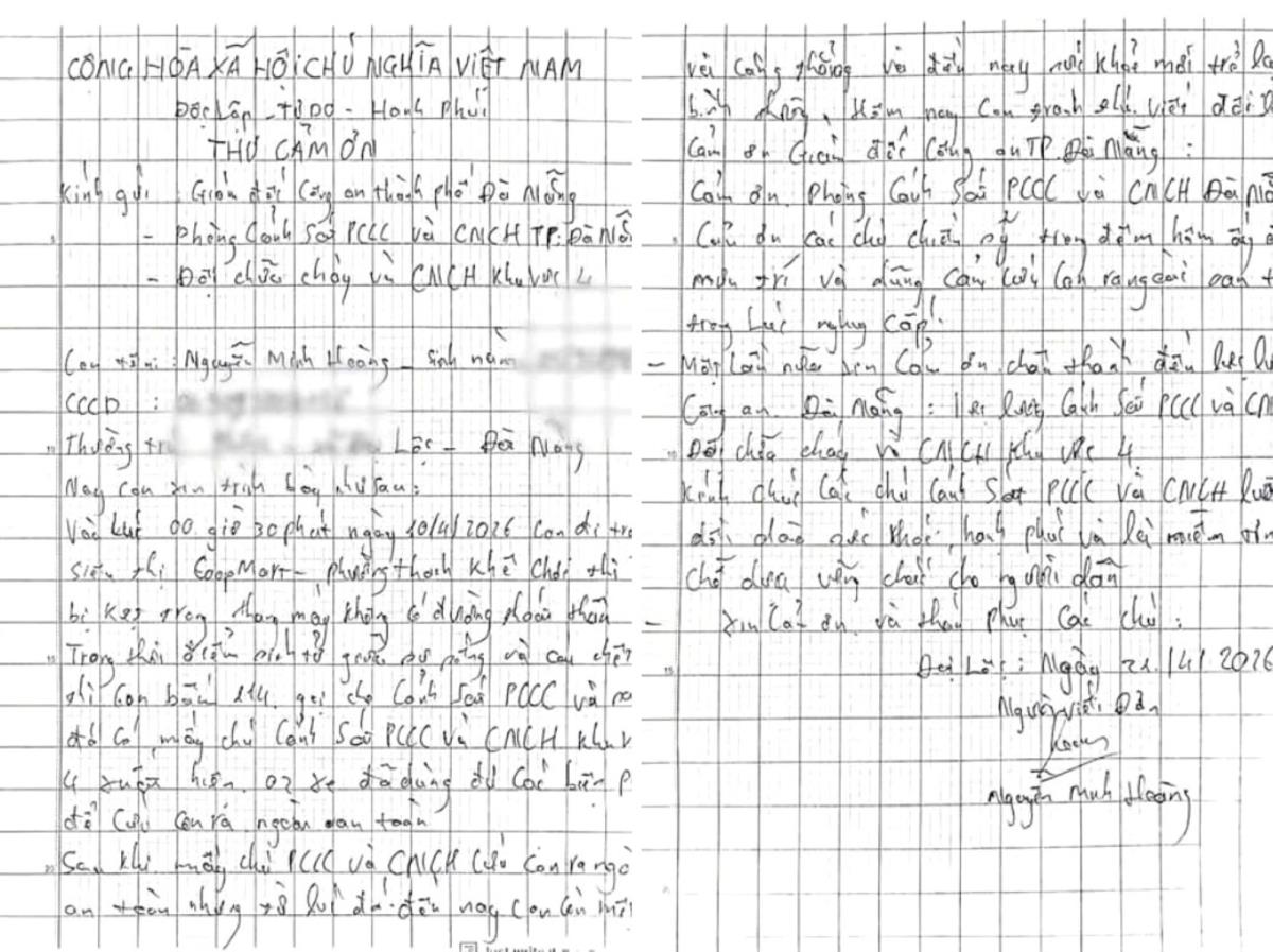 Xúc động trước sự tận tâm của các chiến sĩ, anh Hoàng đã viết thư gửi Giám đốc Công an TP Đà Nẵng, Phòng Cảnh sát PCCC và CNCH, Đội Chữa cháy và CNCH khu vực 4 bày tỏ sự cảm kích. Trong thư, anh chia sẻ: “Thời điểm sinh tử giữa sự sống và cái chết, con gọi cho Cảnh sát PCCC và các chú đã xuất hiện kịp thời. Con thán phục và cảm ơn các chú đã mưu trí, dũng cảm cứu con trong lúc nguy cấp”.