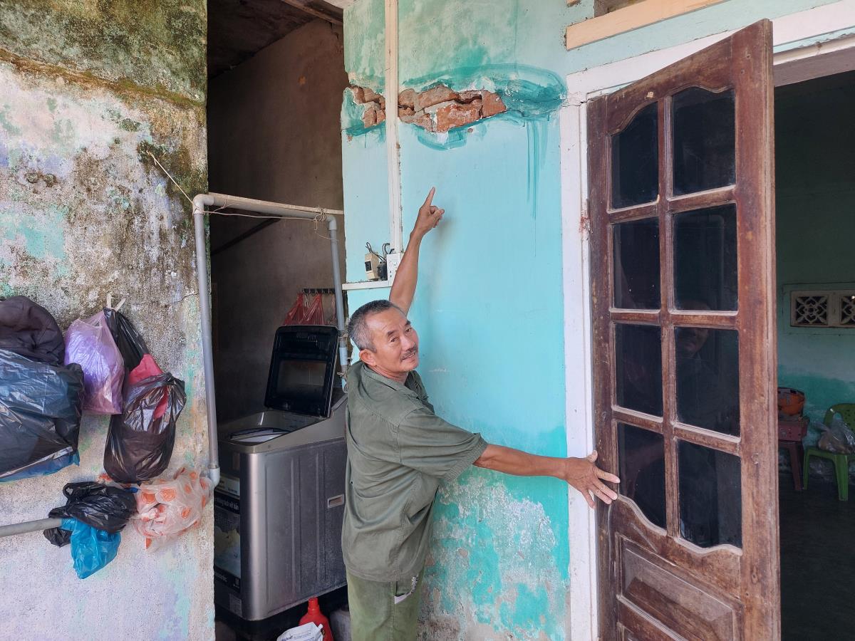 Sáng 7-7, bà Nguyễn Thị Kim Mai- Trưởng thôn Hòa Khương Đông dẫn chúng tôi đi thực tế vòng quanh thôn. Tại nhà ông Nguyễn Lê, một trong những hộ dân bị nứt nhà nghiêm trọng, ông Lê dẫn chúng tôi đi quan sát toàn bộ ngôi nhà đã bị nứt hoàn toàn, chỉ cần một cơn gió mạnh, ngôi nhà có nguy cơ sụp đổ. Gia đình ông Lê có 3 nhân khẩu, 2 vợ chồng già cùng đứa con đi làm công nhân. Ông Lê lo lắng, thời tiết năm nay diễn biến phức tạp, nếu có gió bão lớn, nhà sụp xuống không biết trú ở đâu…!