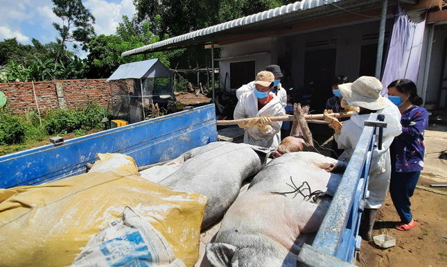 Cán bộ thú y xã Duy Phú (H. Duy Xuyên) mang lợn bị dịch đi tiêu hủy.