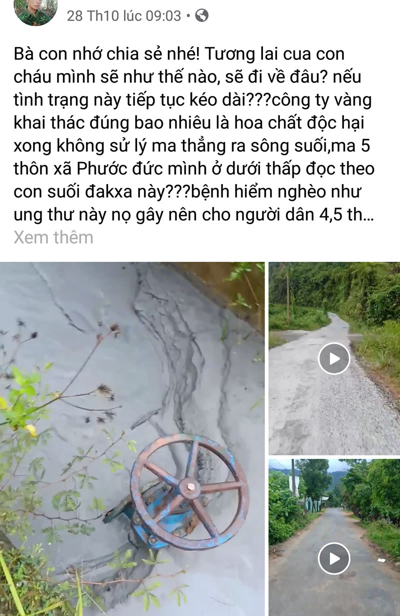 Anh T. cho biết thêm, phát hiện thấy Cty xả thải, anh gọi điện ngay cho trưởng thôn 4 đến kiểm tra, tuy nhiên đến trưa người này mới đến, lúc này dòng suối đã bắt đầu trong trở lại. “Bức xúc trước hành vi xả thải trực tiếp ra môi trường của Cty vàng Phước Sơn, tôi đã ghi hình và đưa lên mạng xã hội để mọi người cùng biết. Sau đó chính quyền địa phương đã xuống làm việc”, anh T. thông tin thêm.