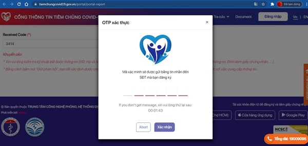 Bước 5: Nhập mã OTP nhận được từ hệ thống TIEM CHUNG gửi tới số điện thoại đăng ký ở bước 2, và bấm “Xác nhận” để kết thúc phản ánh.