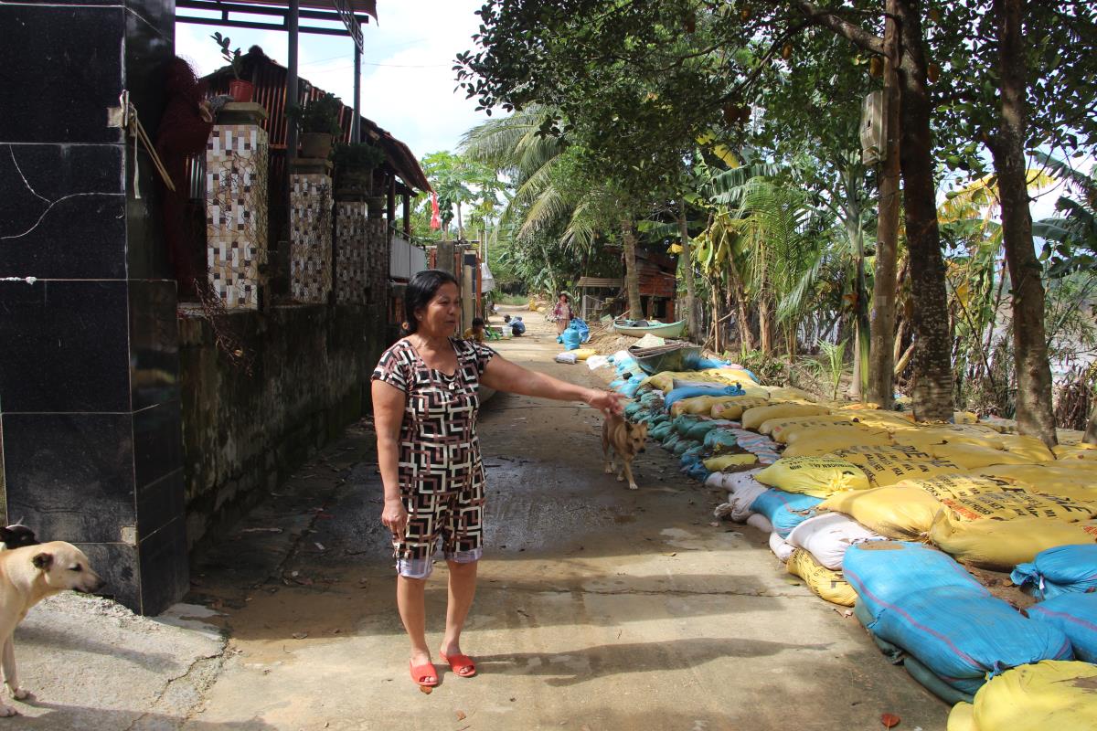 Căn nhà bà Phạm Thị Thân (60 tuổi) chỉ còn cách bờ sông khoảng 7 m. Bà Thân thẫn thờ tâm sự, đoạn bờ sông tại tổ 11 đang được kè bằng rọ đá, nhưng kè một đoạn, bỏ một đoạn. Đợt mưa lớn vừa qua, nước sông làm xói lở nghiêm trọng những đoạn không được kè đá, “ăn” sát vào khu dân cư. “Khi nước sông chảy mạnh, tôi nghe tiếng “ầm” liền chạy ra xem thì sững sờ chứng kiến cả khu vườn trồng dừa, cây cối đổ xuống lòng sông. Bờ sông chỉ cách căn nhà tôi chừng 9 bước chân, nhưng có dấu hiệu tiếp tục bị sạt lở. Lo lắng nhà cửa sẽ bị xói lở đổ sập, người dân đội mưa xúc đất trong vườn bỏ vào bao kè hạn chế xói lở; đồng thời thông báo chính quyền địa phương đến hỗ trợ kè đoạn bờ sông này”- bà Thân chia sẻ.