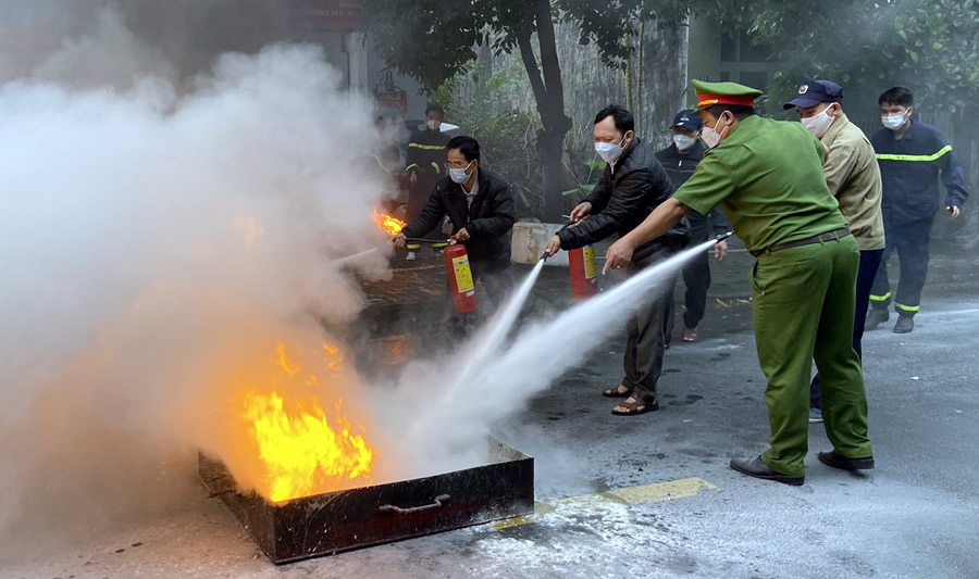 Thiếu tá Hoàng Quốc Hải hướng dẫn người dân sử dụng bình chữa cháy.