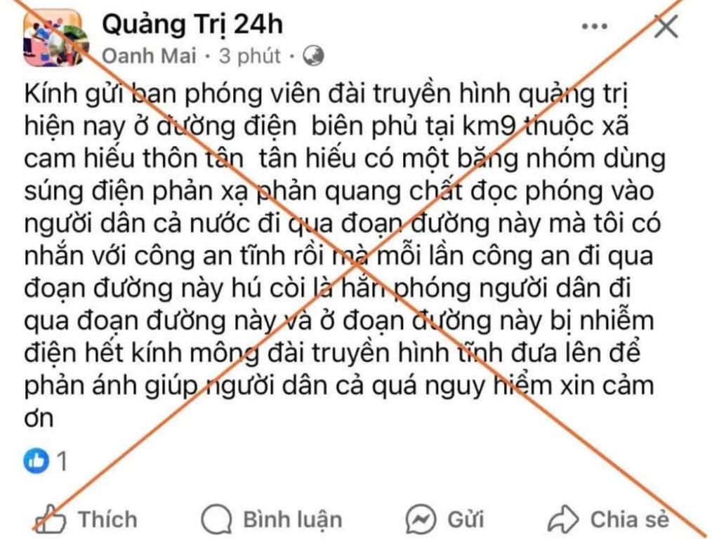 Theo đó, bà M.T.O (1979, tạm trú xã Hiếu Giang) sử dụng tài khoản mạng xã hội Facebook đăng thông tin tại Km9 đường Điện Biên Phủ (xã Hiếu Giang) có một băng nhóm sử dụng súng điện phản quang phóng vào người đi đường.