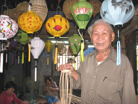 Cuối thế kỷ XVI, người Trung Hoa và Nhật Bản đến Hội An, dựng lên những hội quán, treo lên những chiếc đèn lồng. Khi chiến tranh dẫm nát thế kỷ XX, những chiếc đèn cổ xưa này nép mình trong góc tối, chờ một lần được chủ nhân treo trong đêm hoa đăng. Cụ Ba không phải người Hội An gốc. Cụ sinh ở H. Thăng Bình (Quảng Nam), nơi có tre mọc trên cát cháy. Hồi nhỏ, cụ chả thèm lấy lá dừa làm chong chóng, lấy lá mít làm trâu, mà vót tre đan nên cái nón, con chim làm đồ chơi. Lớn lên một tí, còn biết đan mũ, thúng, rá phụ gia đình. “Bán được chiếc thúng đầu tiên, tôi cầm tờ tiền đưa mẹ, mắt mẹ bỗng rưng rưng; từ dạo ấy, tôi biết tre sẽ nuôi sống đời mình”–cụ nói.