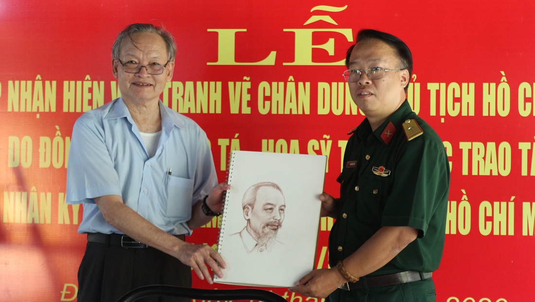 Thiếu tá Thân Ngọc Huệ- Giám đốc Bảo tàng Quân khu 5 nhận 2 tập tranh vẽ về Bác Hồ từ Thượng tá Trần Ngọc. |