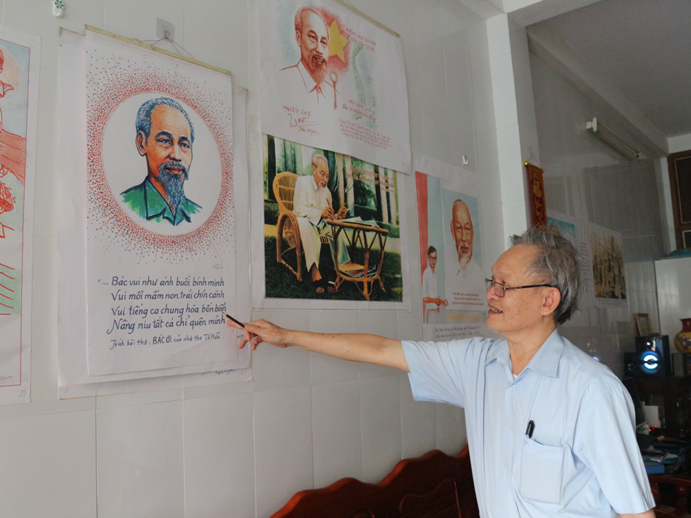 Kết thúc buổi trao hiện vật về Bác Hồ, tôi đến nhà Thượng tá Trần Ngọc nằm trong một con kiệt nhỏ trên đường Duy Tân (Đà Nẵng) chiêm ngưỡng vô số bức tranh được họa bằng chì, bằng màu về Bác Hồ trưng bày đầy khắp cả căn phòng khách. Dù chưa qua trường lớp đào tạo về vẽ hay lớp học nghệ thuật nào nhưng bằng năng khiếu và niềm đam mê bất tận, Thượng tá Trần Ngọc đã dành hơn nửa đời người để vẽ chân dung, làm thơ và cả viết nhạc về Bác Hồ. Vừa ngắm nhìn tranh của ông, tôi vừa chăm chú nghe câu chuyện ra đời của những bức tranh này.