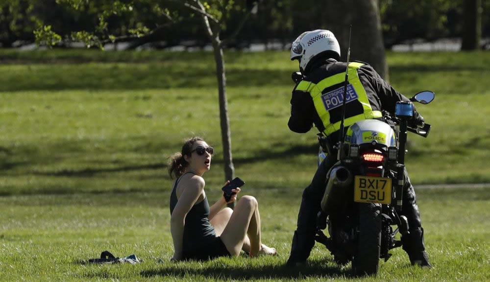 Cảnh sát ở London, Anh nhắc nhở một phụ nữ “hãy về nhà” trong bối cảnh nước này thắt chặt quy định cách ly xã hội phòng chống dịch. Ảnh: AP |