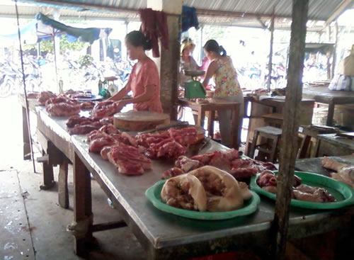 Theo ghi nhận của chúng tôi, hơn một tuần qua, khoảng 50 hộ kinh doanh thịt heo tại chợ Túy Loan (xã Hòa Phong) điêu đứng vì lượng thịt bán ra quá ít. Quan sát tại chợ, những sạp bán thịt heo thưa thớt và khá vắng vẻ; trong khi đó, các mặt hàng bán thủy hải sản bên trong lại tấp nập người mua. Bà Nguyễn Thị Hai kinh doanh thịt heo cho biết: “Trước đây, bình quân mỗi ngày, các hộ kinh doanh thịt heo bán hơn 3 tấn thịt, nhưng vài ngày trở lại đây sức tiêu thụ sản phẩm thịt heo giảm đến 65% so với trước thời điểm có thông tin về dịch bệnh”. Sạp của bà, ngày bình thường bán 50-60kg thịt heo thì nay 20kg cũng vẫn ế, mặc dù thịt heo đã có dấu kiểm dịch. Cũng theo bà Hai, các cơ quan liên quan cần phải tác động đến người tiêu dùng, chứ cứ thế này thì chỉ có nước đóng sạp, lấy đâu tiền đóng thuế!