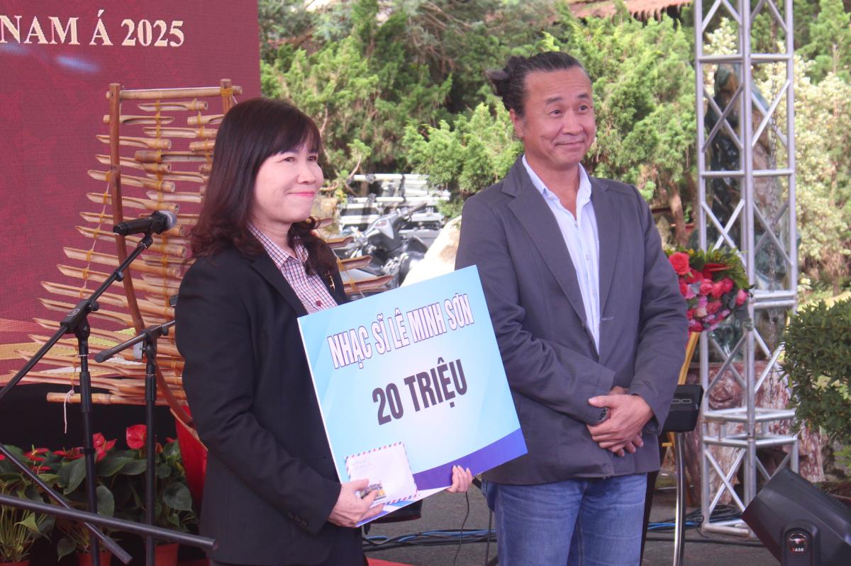 Chiều 23-11, nhạc sĩ Lê Minh Sơn - hội viên Hội Nhạc sĩ Việt Nam, tác giả của những ca khúc nổi tiếng như "Ôi! Quê tôi", "À í a", "Giếng làng"... trong chuyến công tác tại Đà Lạt để chuẩn bị cho Lễ hội Cồng chiêng Đông Nam Á năm 2025 đã trao 20 triệu đồng cho Ủy ban Mặt trận Tổ quốc Việt Nam tỉnh Lâm Đồng hỗ trợ người dân Lâm Đồng bị lũ lụt.