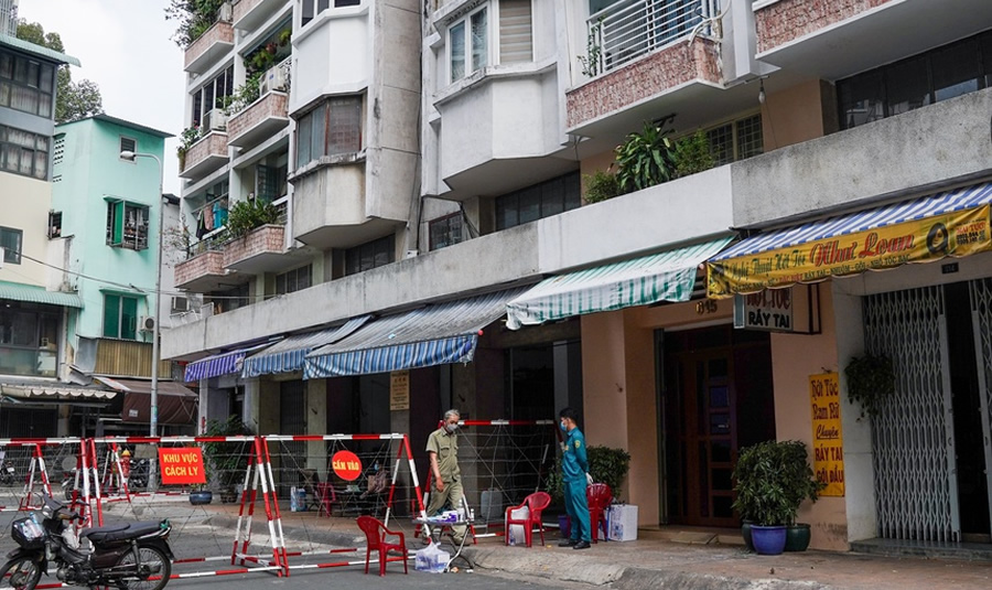 Lực lượng chức năng TPHCM phong tỏa một phần chung cư Sư Vạn Hạnh, quận 5, nơi ca nghi mắc Covid-19 sinh sống. |