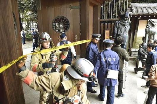 Cảnh sát và lính cứu hỏa đang điều tra tại đền Yasukuni. Ảnh: Reuters |