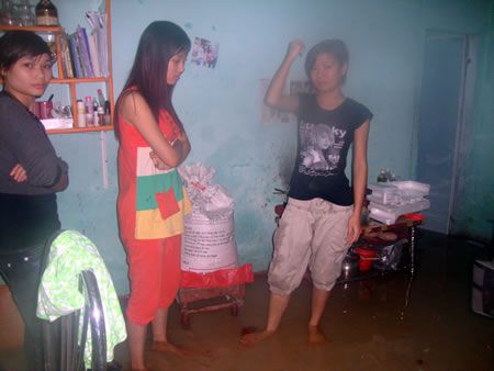 Phạm Thu Phương – sinh viên năm 3 ĐHSP đang thuê phòng tại K457/71-Tôn Đức Thắng cho biết: “Mỗi đợt mưa bão đến là sinh viên cả dãy phòng trọ của tụi em rất khổ, nước ngập vào tận nhà nên mọi sinh hoạt đều bị đảo lộn”. Quần áo bị ướt, chỗ nấu ăn bị ngập nước nên phải ăn cơm bụi, căn phòng nhỏ khoảng 15m2 chỗ nào cũng dột, duy chỉ có vị trí đặt chiếc giường ngủ là an toàn nhất nhưng lại phải kê thêm mỗi bên chân giường 5 cục gạch cao lên kẻo nước dưới sàn nhà tràn lên ướt lưng. Vậy nhưng, tối ngủ, hơi nước bốc lên hôm sau bị đau không đi học được.