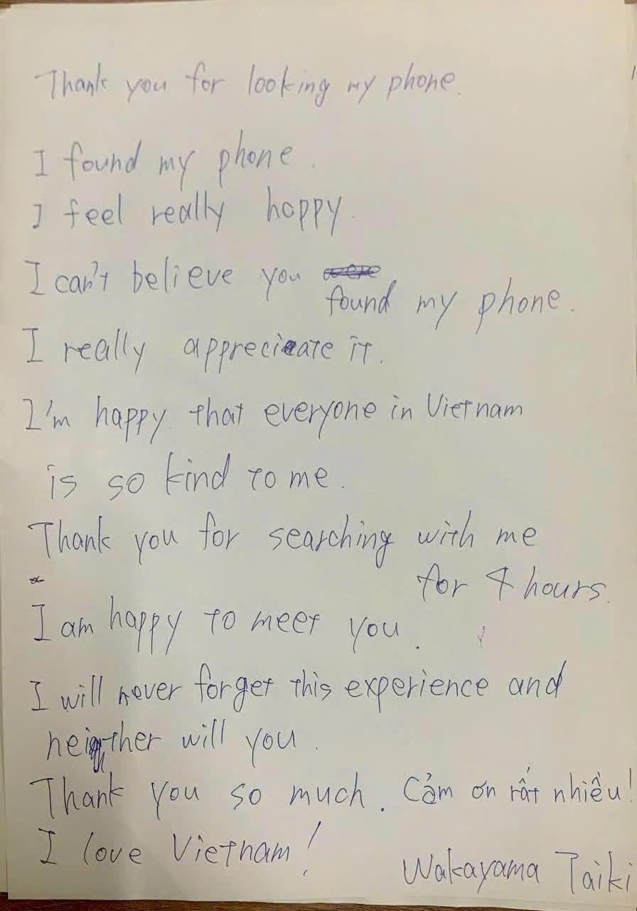 Sau khi nhận lại điện thoại, anh Taiki đã gửi thư cảm ơn đến Công an phường An Hải và những người dân Đà Nẵng đã hỗ trợ. Trong thư, anh bày tỏ: “Tôi thực sự cảm kích, biết ơn con người Đà Nẵng – Việt Nam và đây là trải nghiệm không bao giờ quên trong cuộc đời”. Câu chuyện là một minh chứng đẹp cho tinh thần trách nhiệm, lòng tốt và sự mến khách của người dân thành phố biển Đà Nẵng.