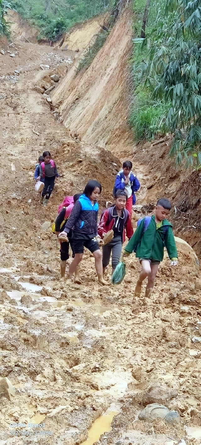 Trẻ em ở xã Chơm lội bùn đến trường do đường bị sạt lở bởi mưa lũ do cơn bão số 5, số 6 vừa qua gây ra.