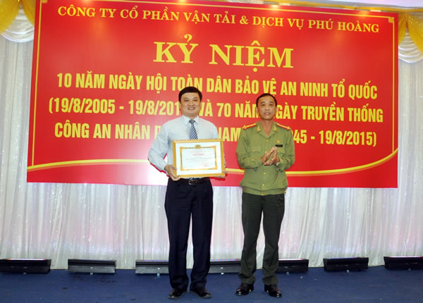 Tại Lễ kỷ niệm do Cty cổ phần VT và DV Phú Hoàng (Taxi Tiên Sa) phối hợp với Phòng An ninh Kinh tế (CATP Đà Nẵng), Đại tá Trần Mưu - Phó Giám đốc CATP Đà Nẵng trao giấy khen của Giám đốc CATP Đà Nẵng cho Cty vì có thành tích xuất sắc trong phong trào toàn dân bảo vệ ANTQ.