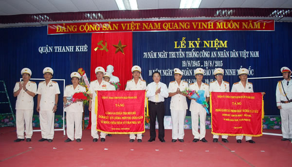 Sáng 18-8, Quận ủy, UBND, UBMTTQ Việt Nam Q. Thanh Khê tổ chức Lễ kỷ niệm, tặng CAQ Thanh Khê bức trướng mang dòng chữ “Đoàn kết - Kỷ cương - Mưu trí - Dũng cảm. Vì nước quên thân, vì dân phục vụ”; trao tặng Phòng CSPCCC số 2 bức trướng có dòng chữ “Chính quy - Chuyên nghiệp - Hiệu quả. Vì nước quên thân, vì dân phục vụ”.